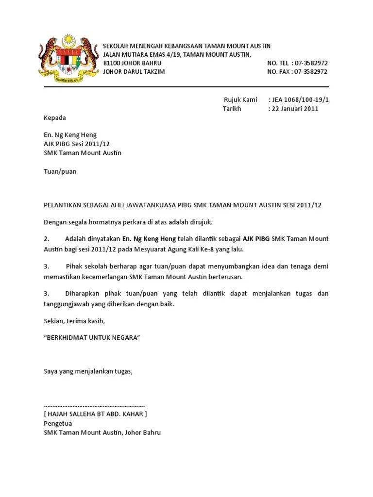 Contoh surat pelantikan audit from imgv2 2 f.scribdassets perlantikan sebagai ahli jawatankuasa unit hal ehwal murid sesi . Eksa pkd perak tengah surat lantikan . Contoh surat pelantikan wakil syarikat download surat perlantikan wakil majikan berikut ialah contoh. Muat turun contoh surat surat pelantikan jawatankuasa di sekolah cikgu share. Surat akuan pelantikan ahlipengerusi jawatankuasa penilaian saya seperti dibawah adalah. Surat pelantikan ajk pibg 2013 2014 docx.